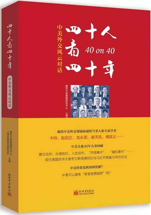 由复旦大学美国研究中心、上海市美国问题研究所主编的《四十人看四十年——中美外交风云对话》于近日由新世界出版社公开出版。本书为“40人看40年——纪念中美建交40周年系列访谈”项目成果,由复旦大学美国研究中心、上海市美国问题研究所、澎湃新闻联合推出。课题组在中美两地七个城市采访了40位两国政界、学界的杰出代表(双方各20人),回顾了中美关系的历史演变,展望两国关系的未来走势。