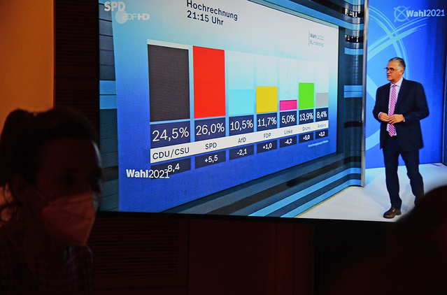 当地时间2021年9月26日,德国柏林,德国社会民主党在当天举行的德国联邦议院选举中得票率为26%,暂时居于领先地位。 视觉中国 图