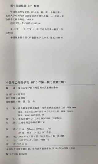 《中国周边外交学刊》2016年第一辑(总第三辑)版权页 |
