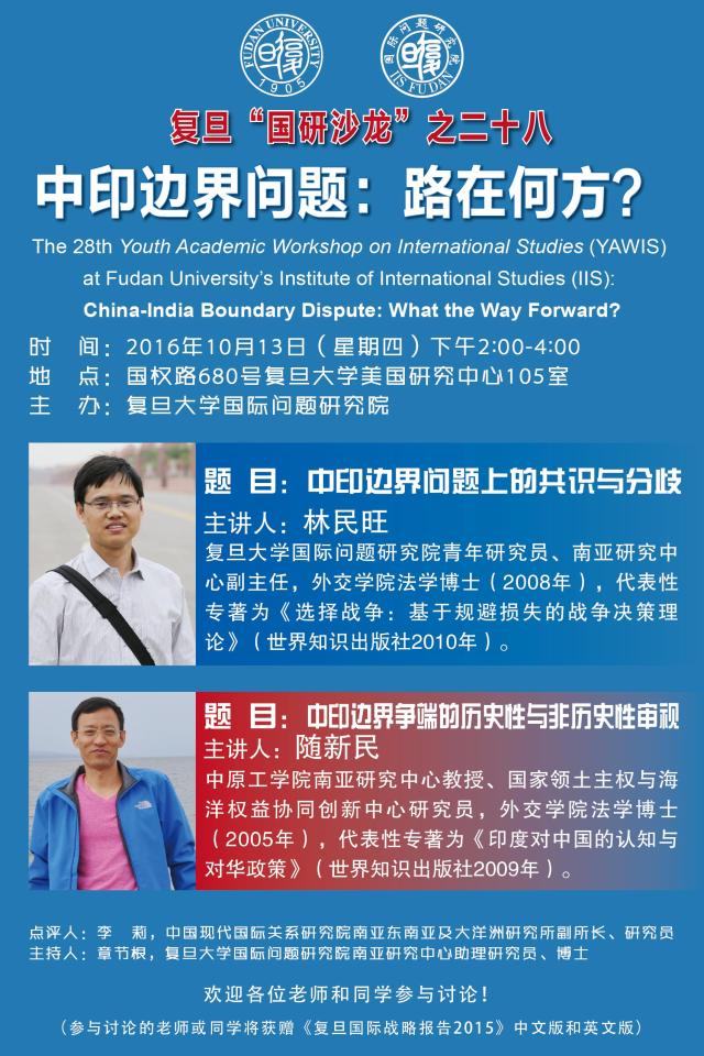 The 28th Youth Academic Workshop on International Studies (YAWIS) at Fudan University’s Institute of International Studies (IIS): China-India Boundary Dispute: What the Way Forward?