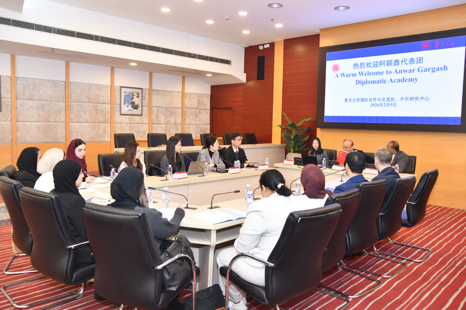 2026年2月9日,阿联酋安瓦尔·加尔加什外交学院(Anwar Gargash Diplomatic Academy)代表团一行9人到访复旦大学国际问题研究院中东研究中心。双方围绕“中国—阿联酋全面战略伙伴关系:变局中的共同未来”这一主题举办座谈会,就当前中阿关系发展、区域合作与全球治理等议题展开深入交流。座谈会由复旦大学中东研究中心副主任张楚楚副教授主持,邹志强青年研究员、王晓宇青年副研究员、国合处项目官员金秋明和博士生马文媛参与。张楚楚转达了复旦大学国际问题研究院吴心伯院长和中东研究中心主任孙德刚研究员对阿联酋代表团的热烈欢迎。