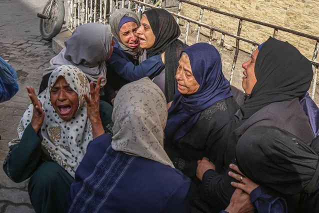 图为以军袭击后的加沙城,当地妇女失声痛哭。