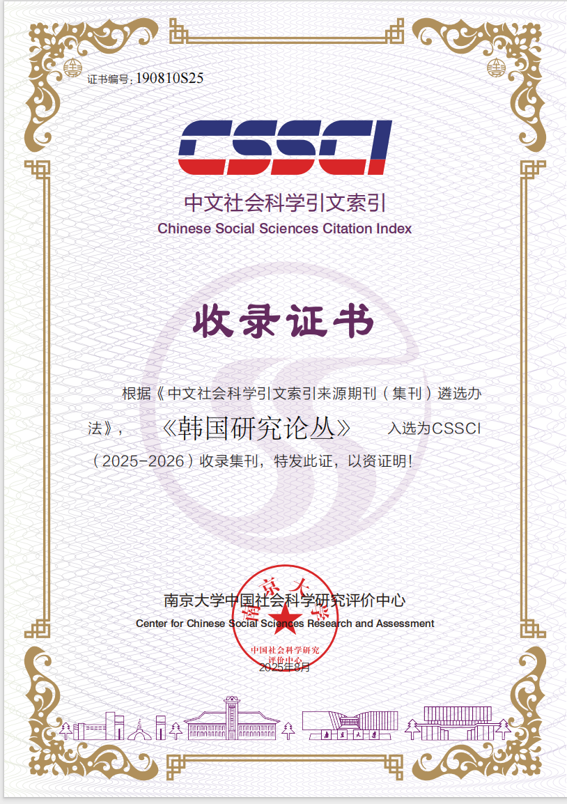 据南京大学中国社会科学研究评价中心2025年8月公告:根据《中文社会科学引文索引来源期刊(集刊)遴选办法》,复旦大学朝鲜韩国研究中心主办《韩国研究论丛》入选为CSSCI(2025-2026)收录集刊。