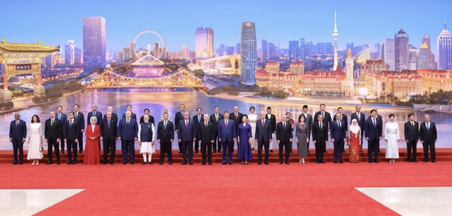 8月31日晚,国家主席习近平和夫人彭丽媛在天津梅江会展中心举行宴会,欢迎来华出席2025年上海合作组织峰会的国际贵宾。这是宴会前,习近平和彭丽媛同贵宾们集体合影留念。(摄影 黄敬文/新华社)