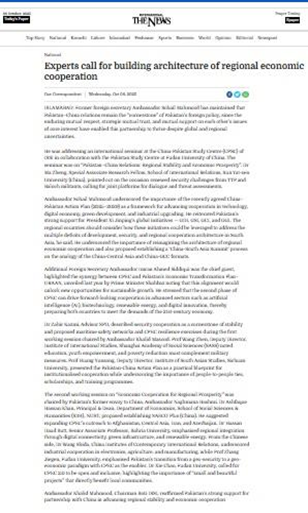 10月8日,巴基斯坦研究中心与巴基斯坦国立科技大学国际和平与稳定研究中心合作主办“中巴命运共同体:中巴两国学者的看法”研讨会。会议围绕近期出台的《中巴关于构建新时代更加紧密的中巴命运共同体行动计划(2025-2029年)》文件,重点研讨中巴经济走廊建设第二阶段如何共同促进经济发展、深化中巴人文交流与学术合作、推动地区互联互通等重要议题,讨论的具体内容涵盖基础设施、投资、教育合作及区域治理,以及打造中巴命运共同体的具体路径。双方认为素有"铁杆兄弟"之称的中巴关系正步入新时代,强调硬基建与软联通协同并进,以实现共同繁荣与长期区域和平。会议还特设了中国学者与巴基斯坦国立科技大学的学生互动的环节,对该校青年学生关心的问题逐一予以回应。