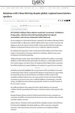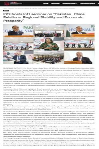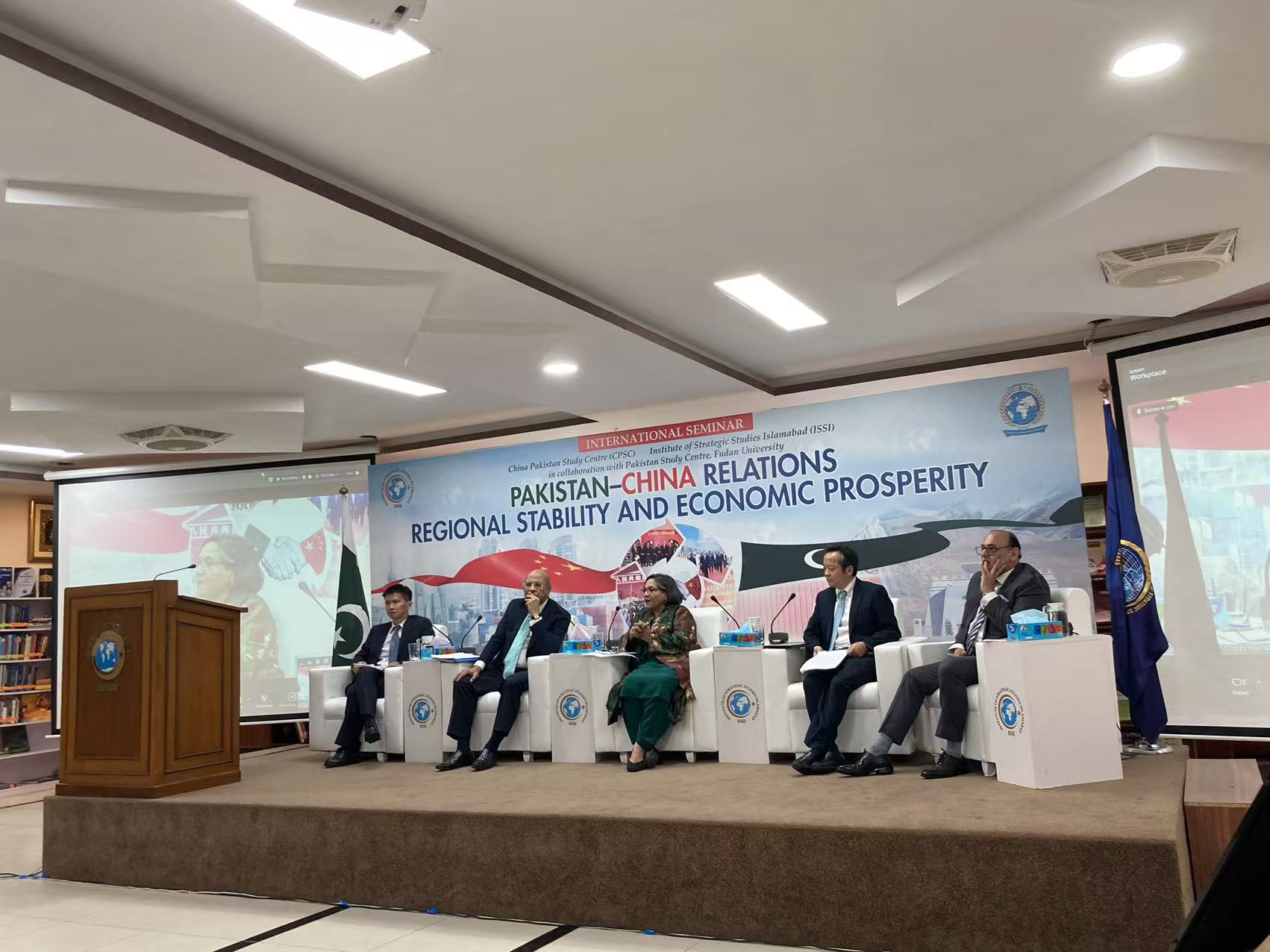 10月6日,巴基斯坦研究中心与伊斯兰堡战略研究所中巴研究中心合作举办“巴中关系:地区稳定与经济繁荣”。伊斯兰堡战略研究所所长索海尔·马哈茂德大使、巴基斯坦外交部副部长(亚太)伊姆兰·艾哈迈德·西迪基、巴基斯坦战略规划局顾问扎希尔·卡兹米等做主旨发言。来自伊斯兰堡各大智库和高校、媒体等近80余人参会。会议分“安全合作促进地区稳定”和“经济合作促进地区繁荣”两个环节,分别由巴基斯坦两位前驻华大使马苏德·哈立德与纳格赫曼娜·哈什米主持。巴方代表强调,巴中关系是巴基斯坦外交政策的“基石”,巴中伙伴关系具有很强的韧性和战略意义,是一种基于信任、相互支持和共享共同愿景的关系。中方代表认为,中巴安全合作是南亚地区平衡与稳定的重要因素,中国在巴基斯坦从地缘安全向地缘经济的战略转型中发挥重要作用,中巴经济走廊已从项目合作导向扩展为多领域合作的框架平台,中巴人文交流将为走廊建设和中巴友好传承持续提供动力。