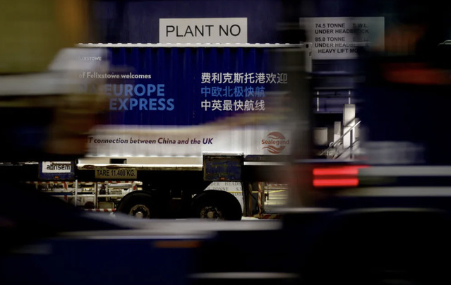这是2025年10月13日在英国费利克斯托港拍摄的印有“费利克斯托港欢迎中欧北极快航”字样的集装箱。新华社记者 李颖 摄