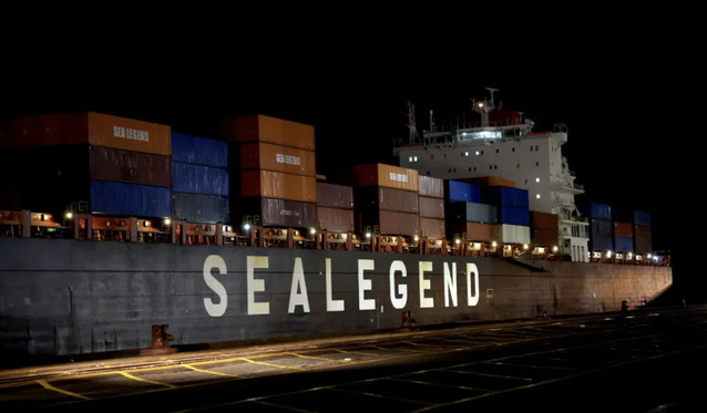 2025年10月13日,在英国费利克斯托港,中欧北极快航航线首艘货船驶入码头。新华社记者 李颖 摄