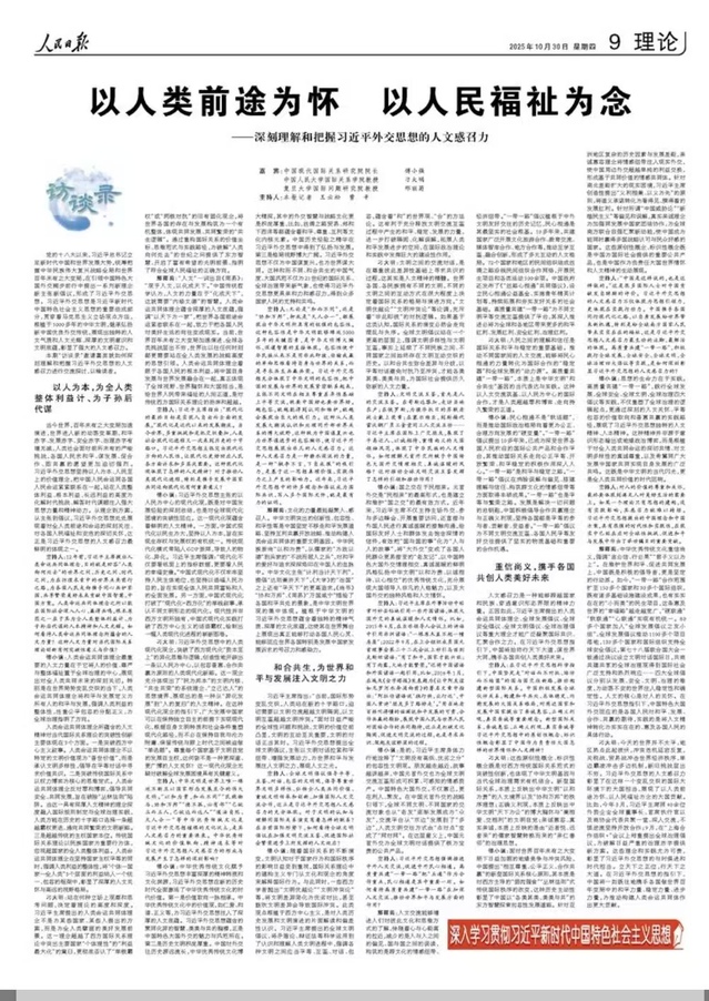 刁大明:今天的世界并不太平,地区热点此起彼伏,冲突危机延宕反复,关税战、贸易战冲击世界经济秩序,单边霸凌冲击多边机制,新旧挑战层出不穷。习近平外交思想的人文感召力彰显了在这样一个变乱交织的国际大环境下的大国担当,展现了以人类前途为怀、以人民福祉为念的大国贡献。比如,今年3月,习近平主席同40余位外资企业全球董事长、首席执行官以及商协会代表共聚一堂、深入交流,不惧逆流坚持开放合作;9月,在“上海合作组织+”会议上郑重提出全球治理倡议,为破解日益严重的治理赤字提供新方案。这些理念和实践尤为可贵,彰显了习近平外交思想的与时俱进和时代担当。立天下之正位,行天下之大道。在习近平外交思想的指引下,中国将一如既往地携手各国做世界百年变局中的和平力量、稳定力量、进步力量,为推动构建人类命运共同体作出更大贡献。