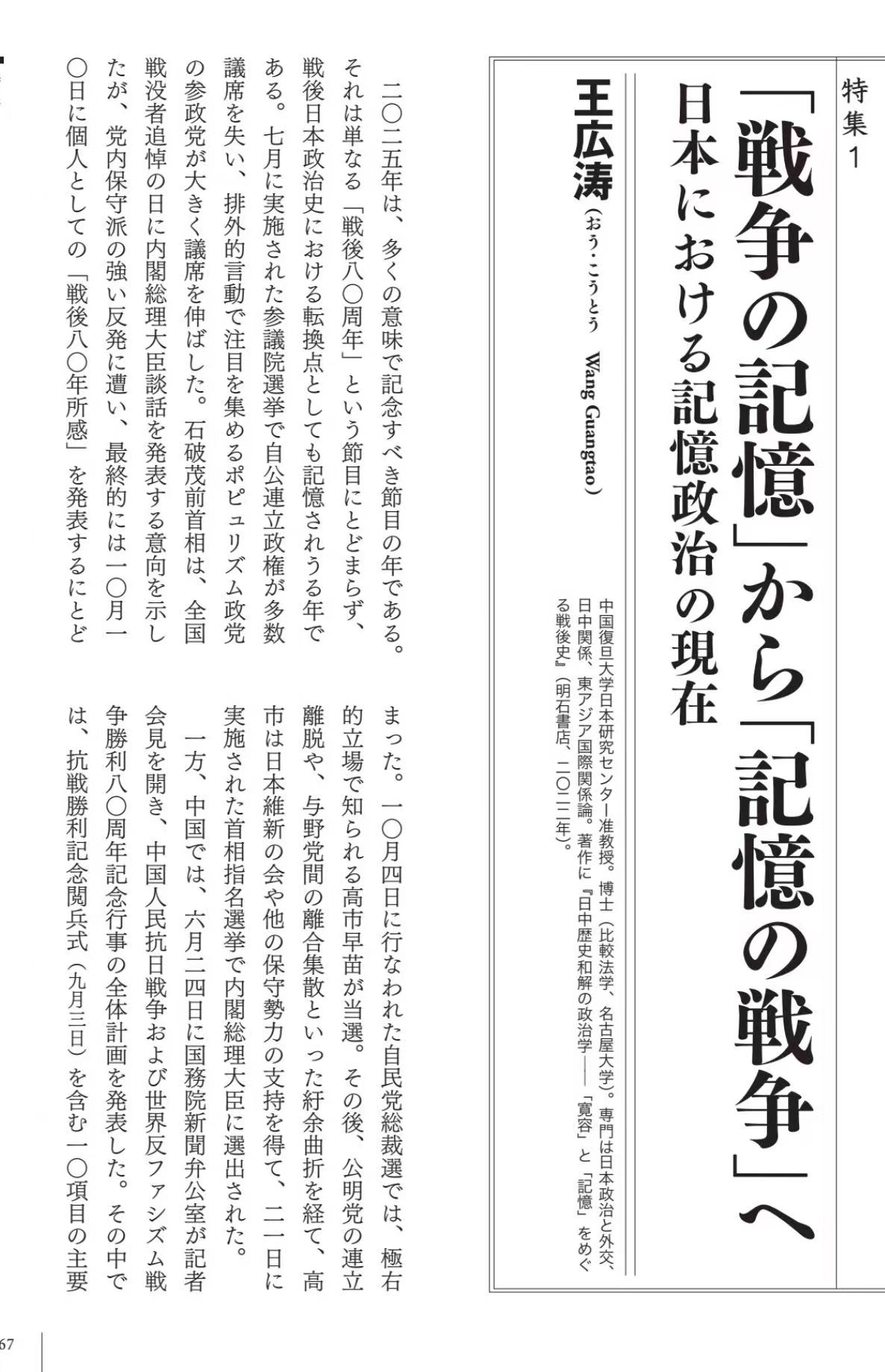 王広涛「『戦争の記憶』から『記憶の戦争』へ――日本における記憶政治の現在
