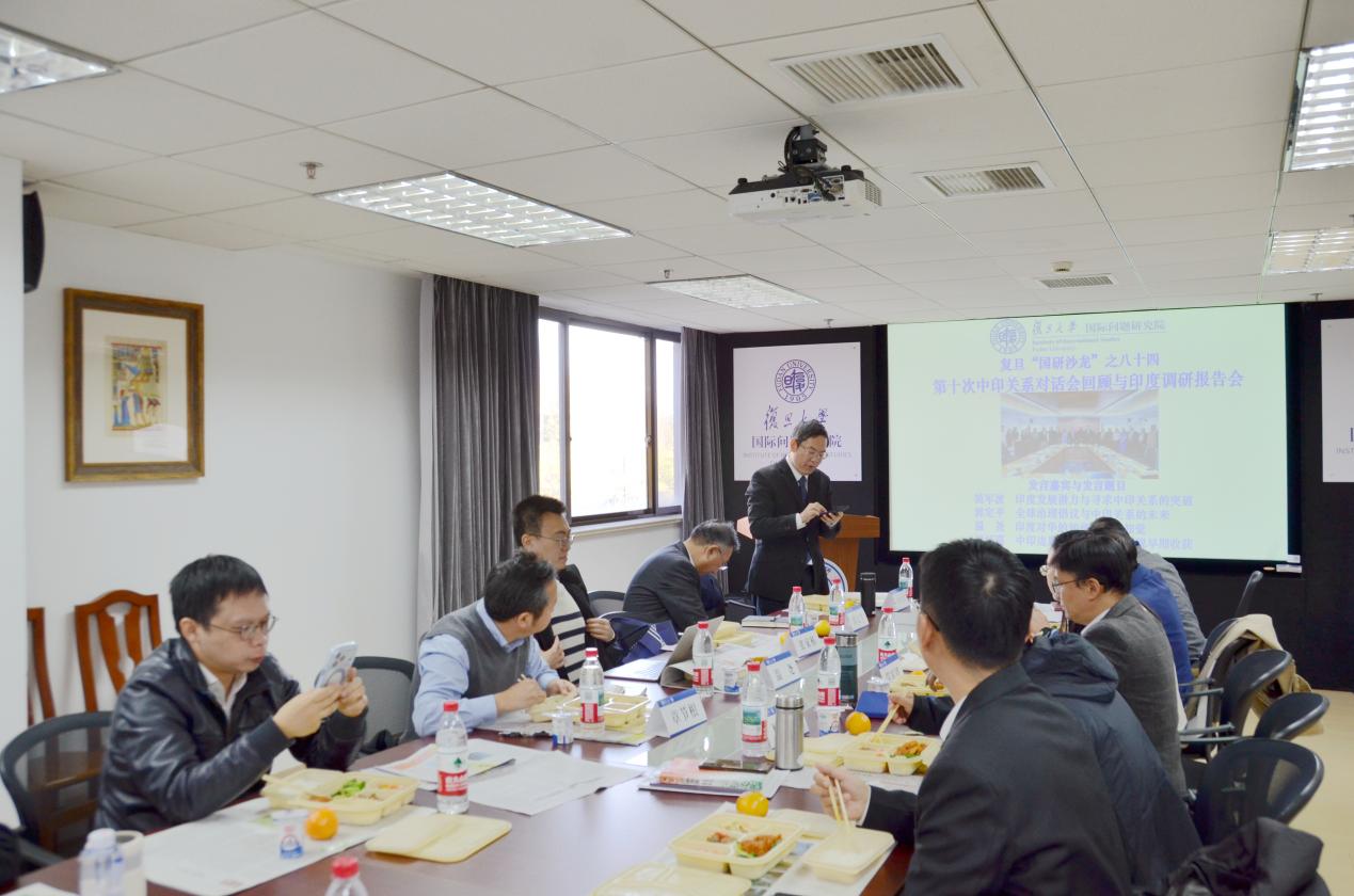 2025年11月20日中午,复旦大学国际问题研究院(简称“我院”)第84期国际问题研究“青年学术沙龙”(简称“国研沙龙”)在文科楼324会议室举行。本期国研沙龙的主题为“第十次中印关系对话会回顾与印度调研报告会”,由我院简军波副研究员、温尧副研究员、祁怀高研究员、国际关系与公共事务学院郭定平教授主讲,我院张家栋研究员总结。我院吴心伯院长出席。来自我院、国际关系与公共事务学院等院系的20余名师生参加了本期国研沙龙。