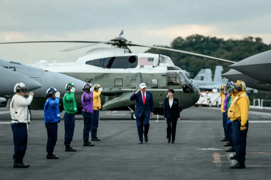 ▲2025年10月28日,特朗普在日本首相高市早苗的陪同下前往驻日美国海军横须贺基地。