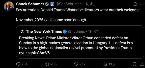 美国民主党人庆祝欧尔班败选 帖文截图