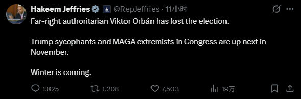 美国众议院少数党(民主党)领袖哈基姆·杰弗里斯同样称,在欧尔班败选后,“国会中的特朗普马屁精和MAGA极端分子将在11月成为下一个目标”。