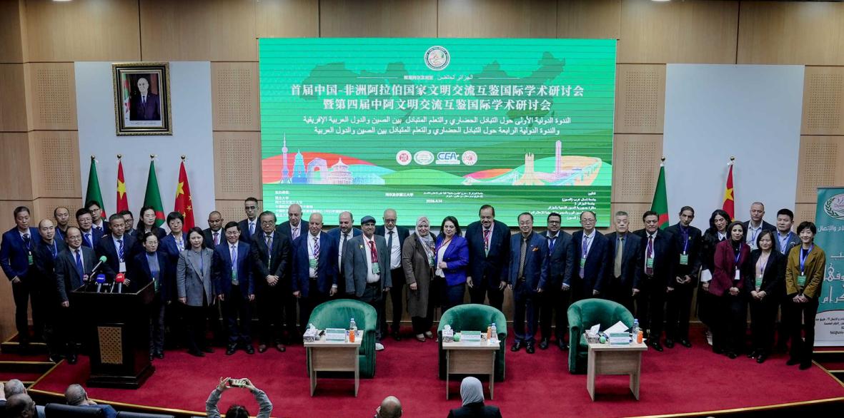 4月14日,代表团参加首届中国—非洲阿拉伯国家文明交流互鉴国际学术研讨会暨第四届中阿文明交流互鉴国际学术研讨会。此次国际会议由西北大学、中国驻阿使馆、中国外文局、复旦大学中东研究中心、阿尔及尔第三大学等单位共同主办。来自中国、阿尔及利亚、埃及、沙特、毛里塔尼亚、阿曼、利比亚、苏丹等十几个国家的高校和研究机构专家学者300多人出席会议。与会专家学者从跨区域、跨领域视角探讨全球南方国家合作新路径,围绕中阿文明交流互鉴、区域发展与合作、中国中东外交等议题展开深入研讨。