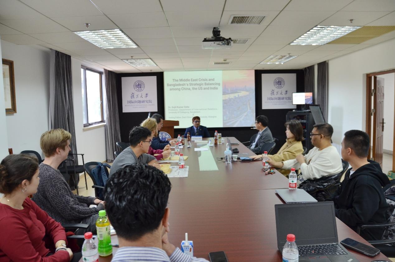 2026年4月15日中午,复旦大学国际问题研究院第九十期“国研沙龙”在邯郸校区文科楼324会议室顺利举行。本次沙龙以中东地缘紧张局势为现实背景,深度探讨孟加拉国在能源安全、经济稳定承压与中美印大国竞争交织下的战略平衡之道,由孟加拉国吉大港大学国际关系学教授苏吉特·库马尔·达塔(Sujit Kumar Datta)主讲。