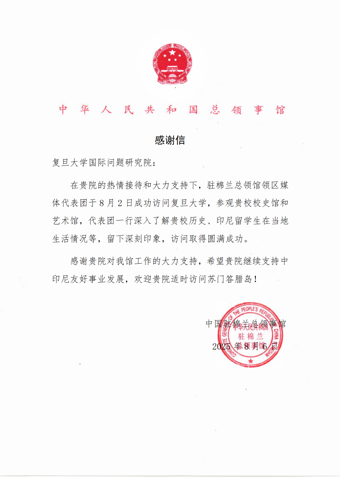 Recently, the Institute received a letter of appreciation from the Chinese Consulate General in Medan, commending the Institute’s warm reception and thoughtful arrangements, and expressing the hope for continued cooperation in advancing China–Indonesia friendship.
