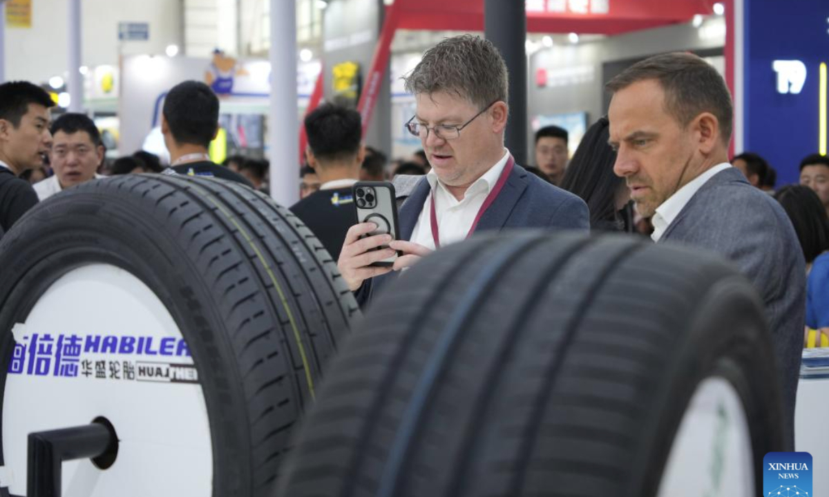 Foreign visitors take photos of rubber tyres at the 15th China (Guangrao) International Rubber Tire & Auto Accessory Exhibition in Dongying City, east China's Shandong Province, May 15, 2025. Featuring over 800 exhibitors, the event has lured professional buyers from more than 70 countries and regions worldwide. (Xinhua/Xu Suhui)